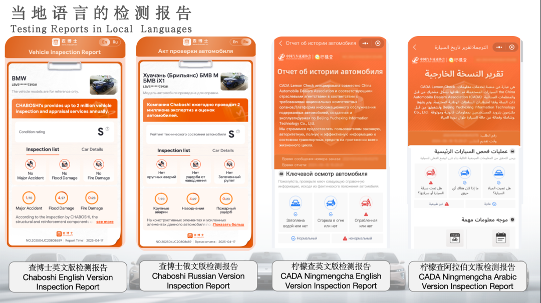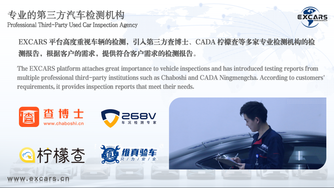 The platform introduces third-party testing institutions such as Dr. Cha and CADA Lemon Cha, provide Chinese, English, Russian, Arabic and other multilingual test reports, to eliminate major accidents, water soaking vehicles, each vehicle can provide detailed vehicle condition files, according to customer needs, to provide test reports that meet customer language needs
